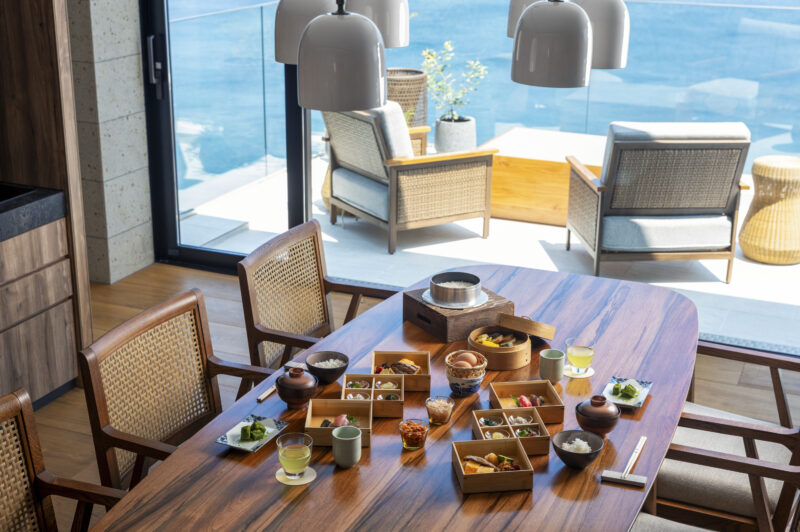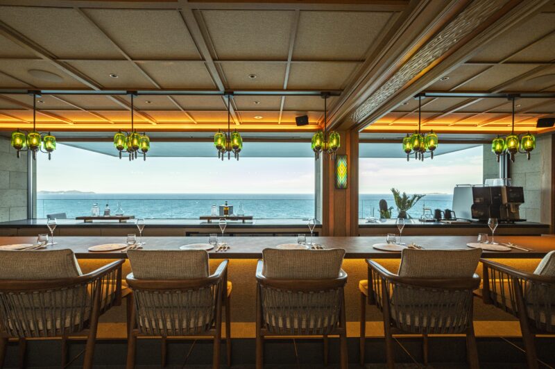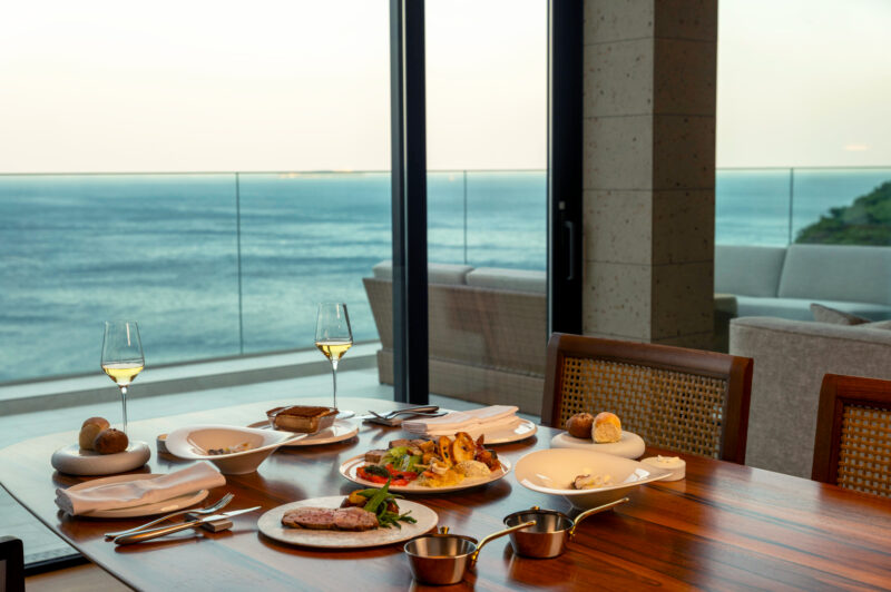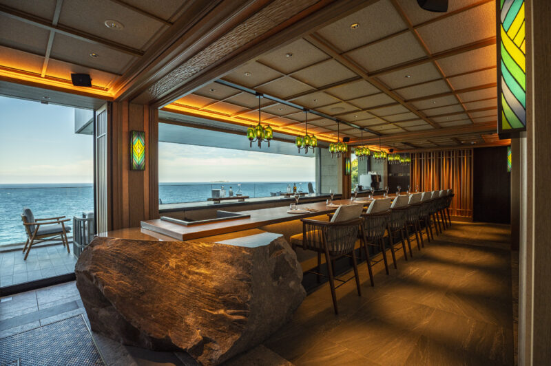 施設内のレストランは、宿泊者だけが利用できる全9席限定の特別な空間。全席カウンター、全席オーシャンビューという贅沢な設えで、目の前に広がる海の景色とともに五感を通して味わう美食体験が最高の時間へと誘う。