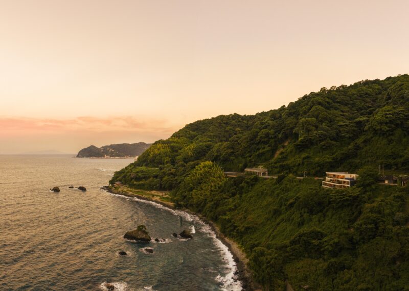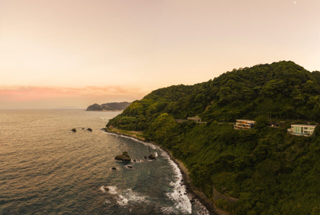 熱海駅から車で15分。再び観光地としての賑わいを見せる中心街を離れ、静寂に包まれた曽我浦海岸沿いに「UMITO 熱海別邸」は佇む。雄大な森と山々に囲まれ、目の前には碧く透き通る海が視界いっぱいに広がる。この唯一無二のロケーションこそが、日常から完全に切り離された特別な時間を約束する。