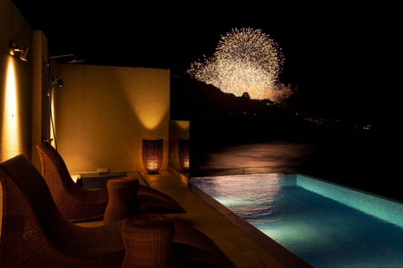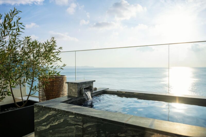 このペントハウス最大の魅力は、専用のインフィニティプール。海と一体化するような浮遊感は格別で、冬季は温水となり季節を問わず楽しめる。朝日に輝く水平線を望み、夜は1年を通して開催される熱海の花火をプールに浸かりながら鑑賞する——そんな贅沢な時間がここにある。