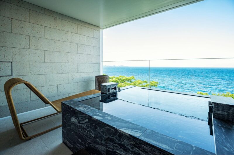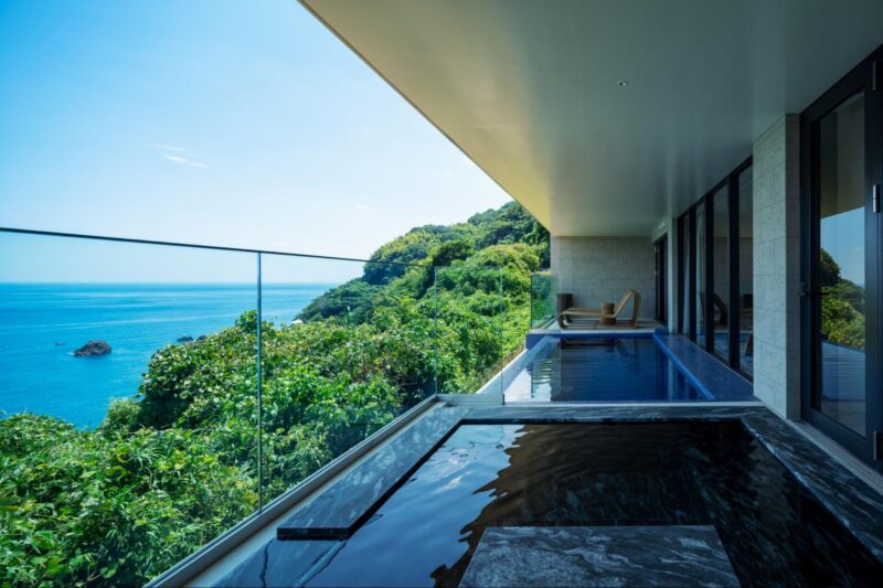 「UMITO 熱海別邸」は、眼前に海を臨む「海最前列」に位置し、雄大な景色をプライベートに満喫可能だ。全客室に専用温泉を完備され、温泉に浸かりながら水平線を望む贅沢な時間は、優雅で非日常なここでしか味わえないひとときだ。