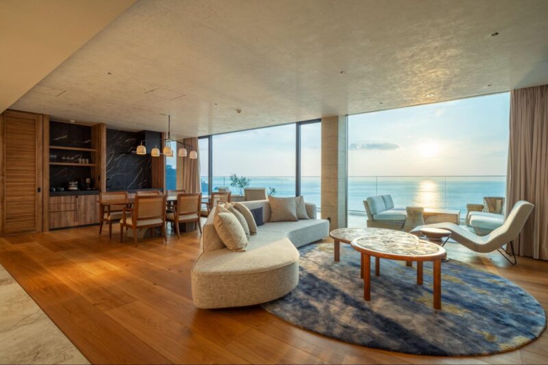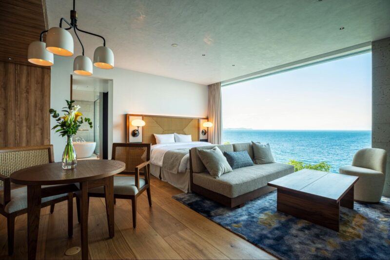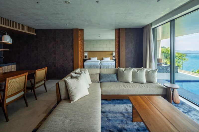 「AMI(デラックスダブルルーム)」は50平方メートル超のコンパクトな設計ながら、少人数でゆったりと過ごせるつくり。3名まで滞在可能で、ベッドの眼前には大海原が広がり、目覚めとともに窓一面の海景が1日の始まりを彩る。