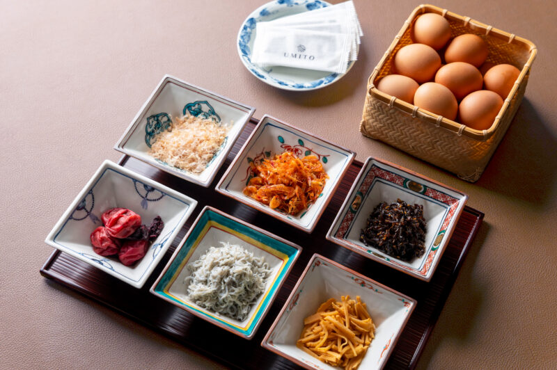 朝食は、UMITO和食総料理長・井上竜一監修の新鮮な魚介や野菜をふんだんに取り入れ、日本料理の基本を大切に細部にまでこだわった和朝食。