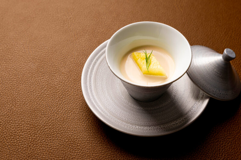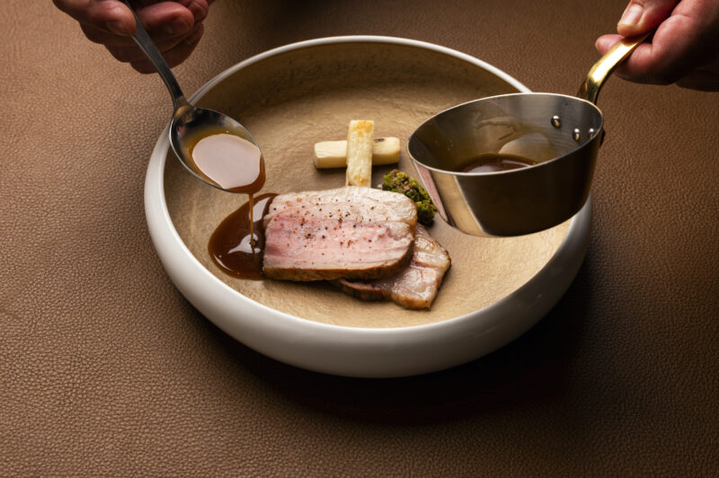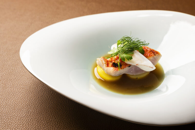 ディナーは、「L’ENBELLIR」「naoto.K」などで通算12個ものミシュラン星を獲得した岸本直人シェフが監修、中居清貴シェフが腕を振るう本格フランス料理となっている。”旬と瞬”をテーマに展開され、静岡県焼津の老舗「サスエ前田魚店」から仕入れる極上の魚介、ひと月にわずか2頭しか飼育されない希少な「岡村牛」、天城の豊かな自然で育てられた「天城黒豚」など、シェフ自らが生産者を訪れて厳選した食材が主役だ。