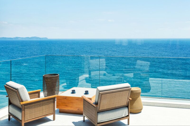 海に向かってせりだした専用テラス一面に広がるパノラマの海景は、圧巻。自然が織りなす最高の風景を特等席から愉しめる。