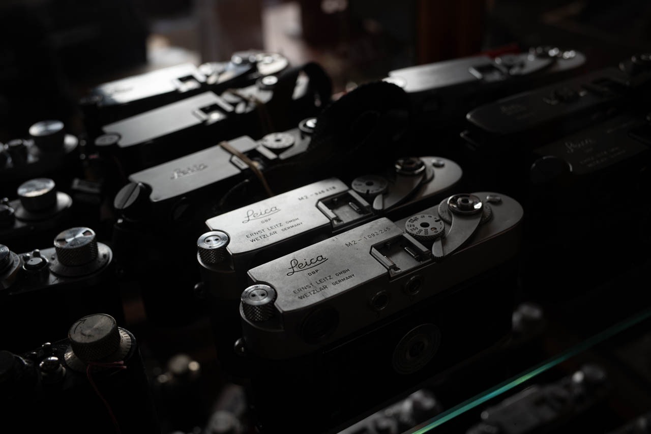 棚にぎっしりと並ぶ、クラシック・ライカの数々。バルナック型からM型初期モデルまで、ドイツ・ヴェッツラー製の精密機械美が静かに光を反射する。100年を迎えるライカの歴史の厚みを、手に取れる距離で感じられる贅沢なひととき。