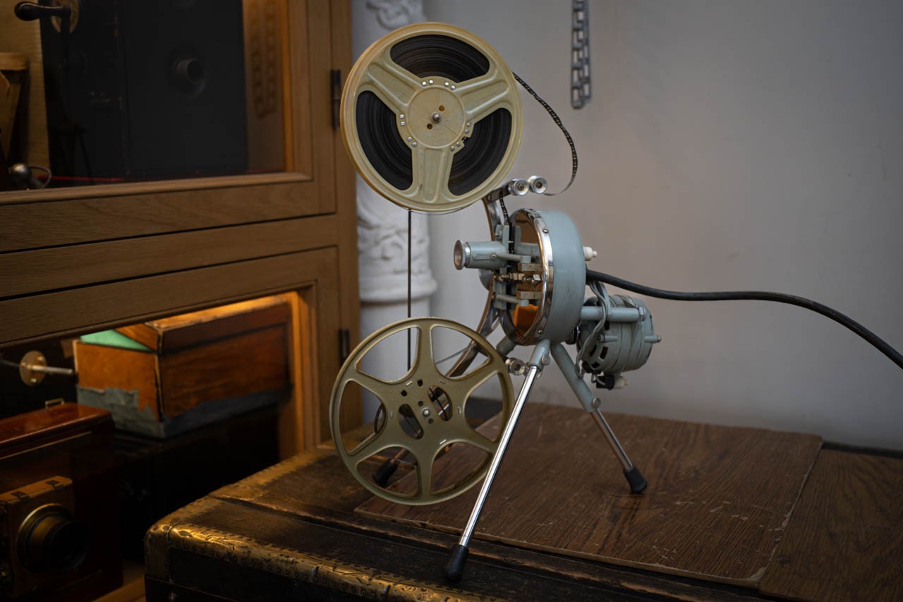 三脚に立つこの可愛らしい機械は、イギリス・Pathé社が1950年代に製造した8mmフィルム用プロジェクター「Pathescope Princess」。家庭用に設計されたコンパクトサイズながら、堅牢な作りと滑らかな巻き取り動作で当時人気を博したモデルだ。リールが回転し始めると、そこにあるのは小さなサロン・シネマ。家庭に映画がやってきた時代の象徴ともいえる一台である。