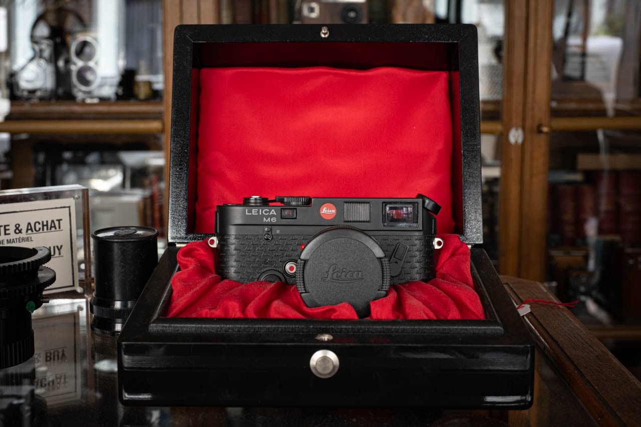 この黒いライカは、限定生産された Leica M6 “Ein Stück Leica” のスペシャルエディション。1996年、Leica社の株式上場を記念して996台のみ製造された。専用の黒塗り木製ケースと証明書が付属し、通常のM6とは異なる装飾と仕上げを持つ。美術的価値と物語性を兼ね備えた、コレクター垂涎の一台。