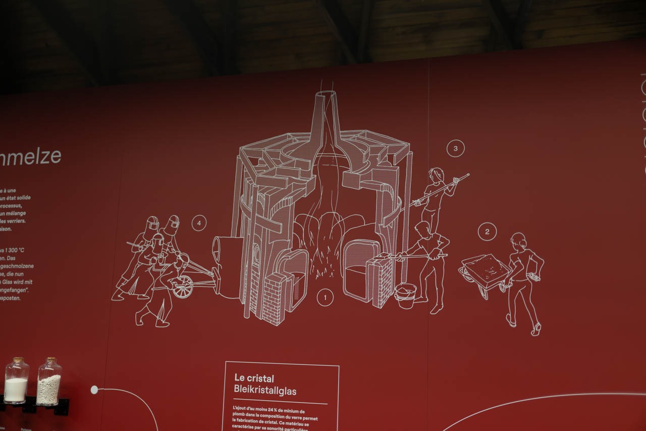 CIAV マイザンタールの館内に設けられた、鉛クリスタル溶解炉の構造と作業工程を示す解説図。珪砂、アルカリ、鉛などの原料は調合後、約1,300〜1,400度の高温で溶融され、炉内部に並ぶ複数の坩堝(るつぼ)から職人が吹き竿でクリスタルを採取する。鉛を多く含むクリスタルは温度管理が極めて繊細なため、溶融炉は一年を通して火を落とすことなく稼働し続ける。ウイヨンの彫刻作品が示す高度な造形美は、まずこの過酷な溶融工程によって支えられていることが、展示を通して具体的に理解できる構成となっている。