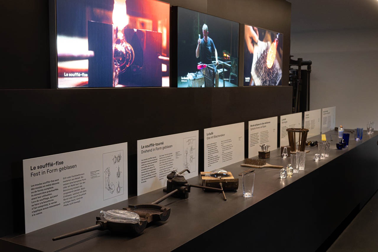 モールを用いてガラスに形を与えていく工程を、実物の道具と映像で解説する展示。溶融したガラスはまず丸く巻き取られ、開閉式の金型(モール)に挟み込まれながら回転させることで、輪郭と装飾が一気に転写されていく。型の内側に刻まれた紋様は、吹き加減と回転の速度によって立体となり、最後は口縁の成形と切り離しへと移行する。大量生産を可能にしながらも、最終的な表情は職人の手の感覚に委ねられるという、工業と手仕事が交差するガラス成形の核心を示す工程だ。