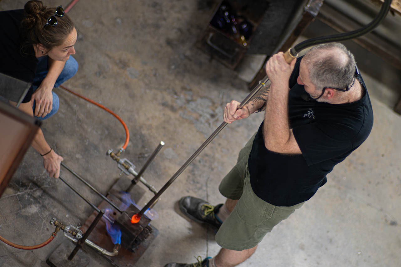 ブール・ド・ノエルの成形には、いまや職人が口で吹き込むのではなく、コンプレッサーから送られる空気が使われている。溶けたガラスがモールの中に収まった瞬間、職人がタイミングを見計らって空気を送り込み、内側から一気に膨らませて形を整える。衛生面と再現性を高めつつも、空気の量と吹き込む時間を決めるのはあくまで人の感覚であり、量産でありながら一本ごとにわずかな個性が宿る工程になっている。