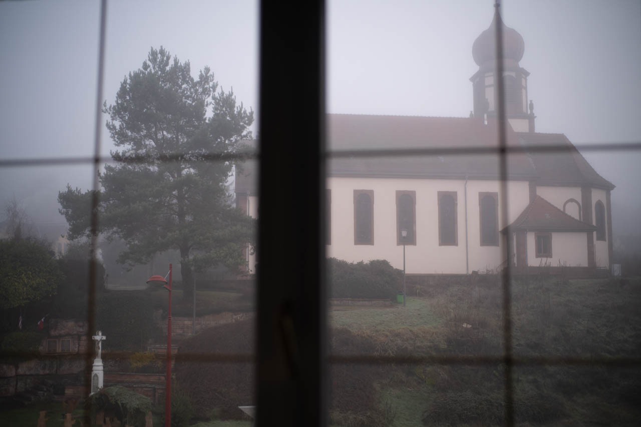 アルザス北部、ガラスの中枢とも言える Wingen-sur-Moder(ヴィンゲン=シュル=モデール)の中心街。霧に包まれた丘の上に建つ教会の姿が、この土地の複雑な歴史を物語る。アルザスは長いあいだフランスとドイツの狭間にあり、19世紀後半から20世紀前半にかけてはドイツ帝国(旧プロイセンを中核とする国家)の統治下にも置かれた。その時代に建てられた教会や公共建築も多く、フランス的な装飾とドイツ的な合理性が混ざり合った独特の景観を今に残している。森と炉だけでなく、こうした歴史の重なりこそが、この地のガラス文化の背景にある。