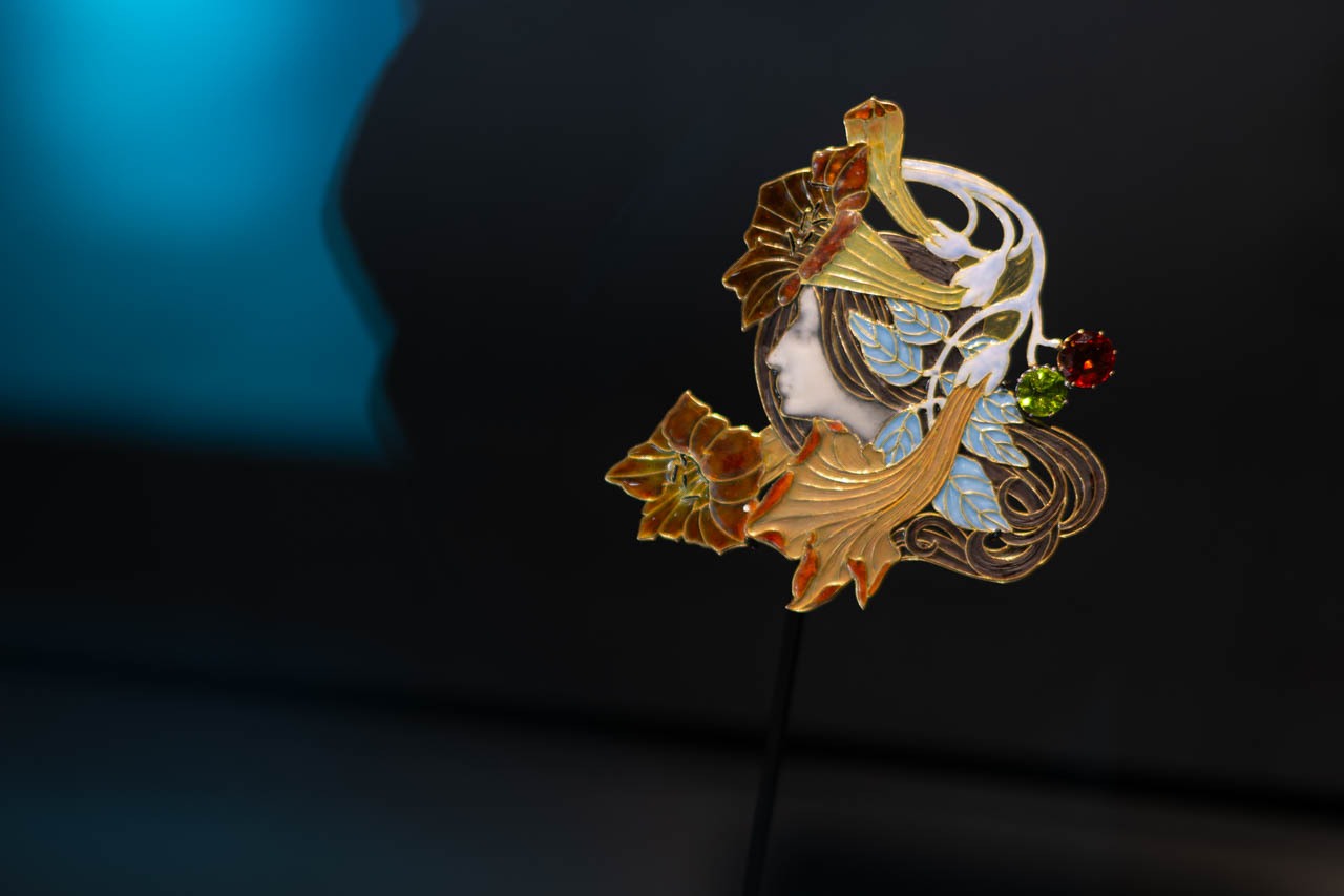 若き日のルネ・ラリックは、まずジュエリーからガラスの可能性を切り開いていった。貴金属と宝石だけで構成される伝統的な宝飾から離れ、透明や半透明のガラス、エマイユ、半貴石、角などを組み合わせることで、女性の横顔や植物モチーフを立体的に浮かび上がらせる。ここに見られるブローチも、金属はあくまでラインを支える骨格にとどまり、光を受けて表情を変えるガラスこそが、ジュエリーの主役として据えられている。