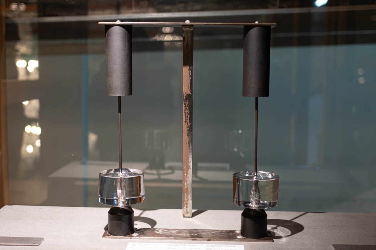 同じ大きさのガラスとクリスタルを並べ、手に取ったときの重量差を体感できる展示。鉛を多く含むクリスタルは、一般的なソーダガラスに比べて比重が高く、持ち上げた瞬間にずしりとした重みが伝わる。この重量感は、後に屈折の強さやカット面の鋭い輝きへとつながっていく、クリスタル特有の物理的な特性そのものでもある。
