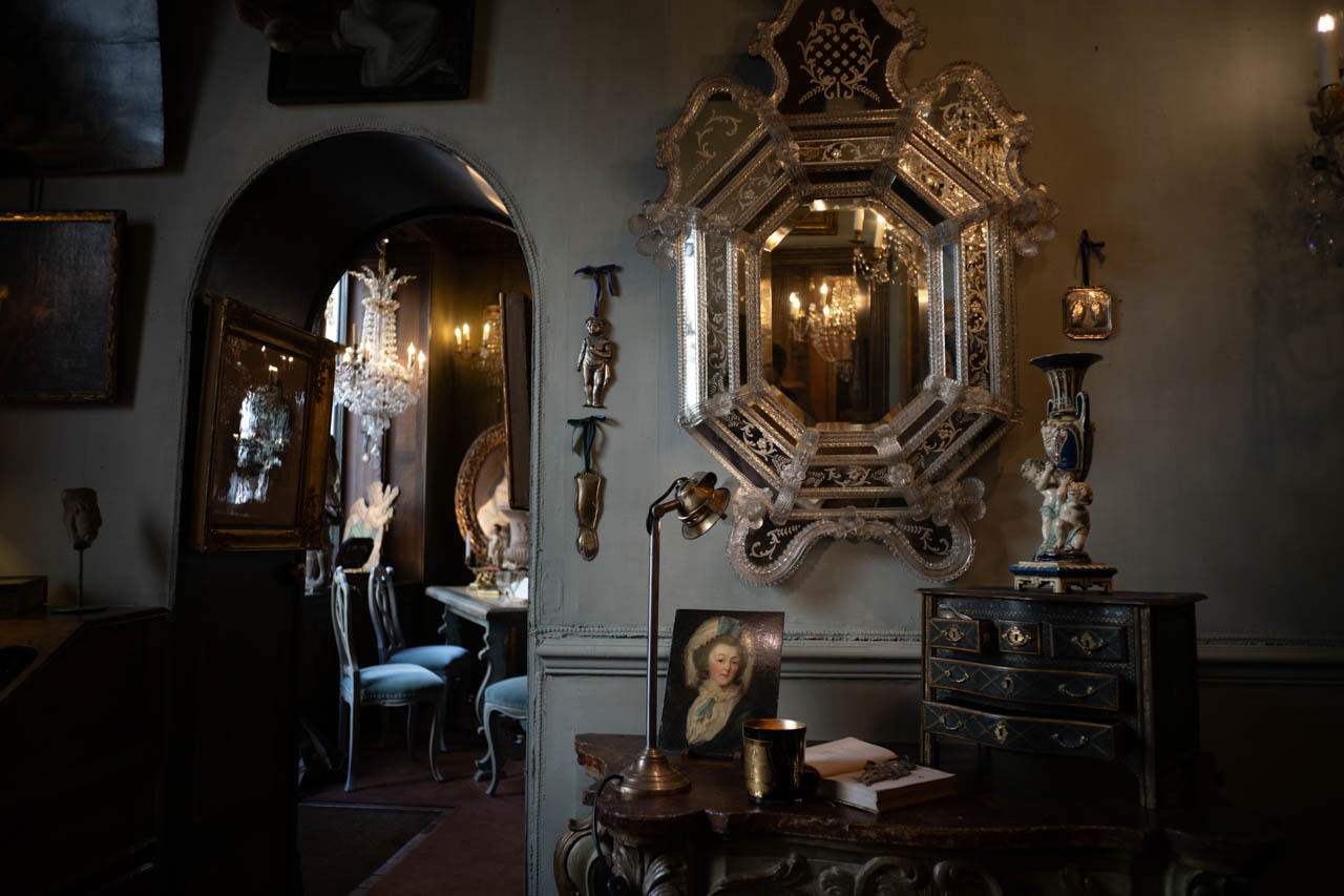 シャンデリアの光が青灰色の壁に柔らかく反射し、時を経た家具や小さな装飾品たちが、それぞれの物語を静かに語っている。アンティークの書物の上に置かれた一枚の女性の肖像、控えめなランプの光、精緻な陶器の小箱——そのひとつひとつに気配が宿る。その空間の中心で、ひときわ優美な存在感を放っていたのが、1940年頃にヴェネツィアで作られた八角形の装飾鏡。斜めに面取りされた鏡面が8枚、繊細な草花模様が刻まれたプレートに囲まれ、接点は六角形のキャップ付きガラスで留められている。上部には葉型のフロントン、そして全体を飾るのはガラスの花々。光が差し込むたび、鏡の中に反射する店内の風景がゆっくりと揺れ、まるでそこにももうひとつの世界があるかのようだった。