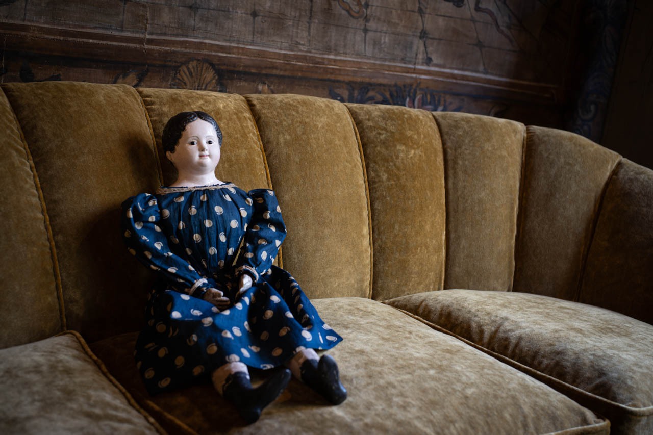 19世紀、青いローブと羽飾りの帽子を纏った幼子の肖像(油彩・33×24cm)。部屋と部屋をつなぐアーチの壁に、まるで時の門番のように佇んでいた。