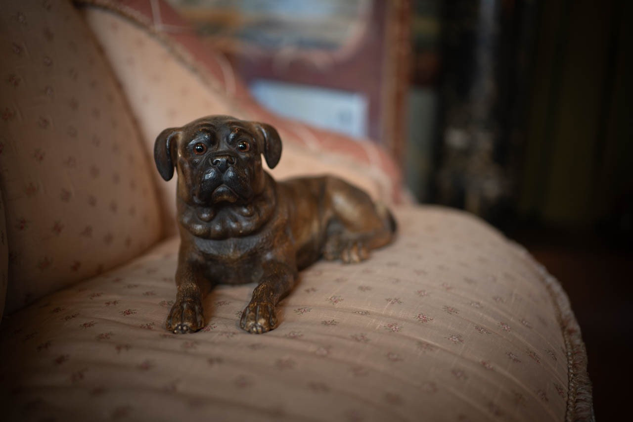 19世紀フランス製の《borne “indiscret”》の上に、小さな番犬がひとやすみ。シルクとベルベットに包まれた優雅な空間に、ぴたりと寄り添う静かなまなざし。