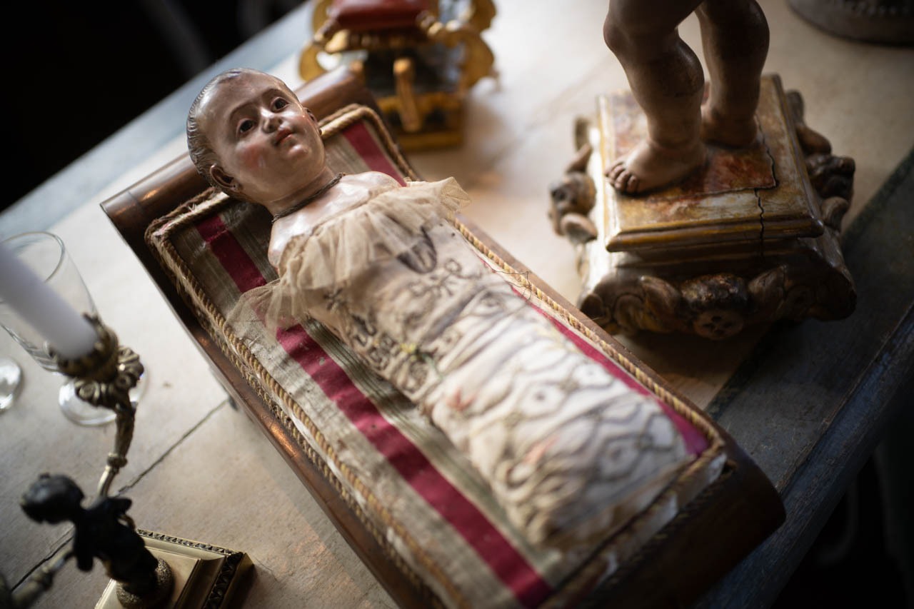 まどろみの中に宿る聖性。19世紀初頭の木彫彩色像《Nativité de la Vierge Marie》。スフル硝子の瞳とオリジナルの刺繍布に包まれた幼子マリアが、静かな光に包まれていた。