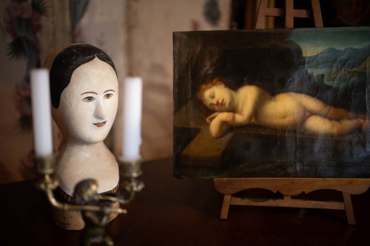 黒髪のマロットが静かに見つめる先には、眠る聖児の夢。19世紀フランスの紙張り子製マロットは、帽子やコワフを保つために作られたもの。パリの「Danjard Vincent」工房製。日常の中の美を支えてきたこの頭部模型は、今日ではどこかオブジェのような詩的な存在へと変わっている。