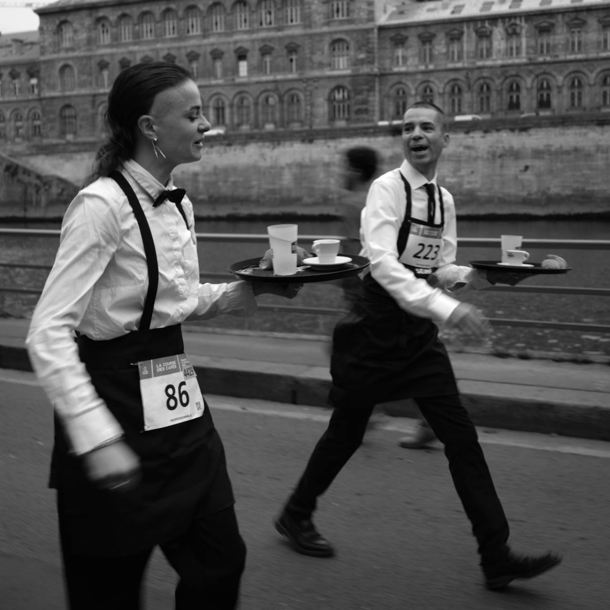 橋の上からの声援を受けてセーヌ川沿いを進む光景は、古き良きパリのギャルソン・マラソンを思わせる。石畳の街を舞台に、日常の所作を芸術的な儀式へと昇華させるこの競走は、職業文化を祝福し、都市の歴史を映し出すものである。