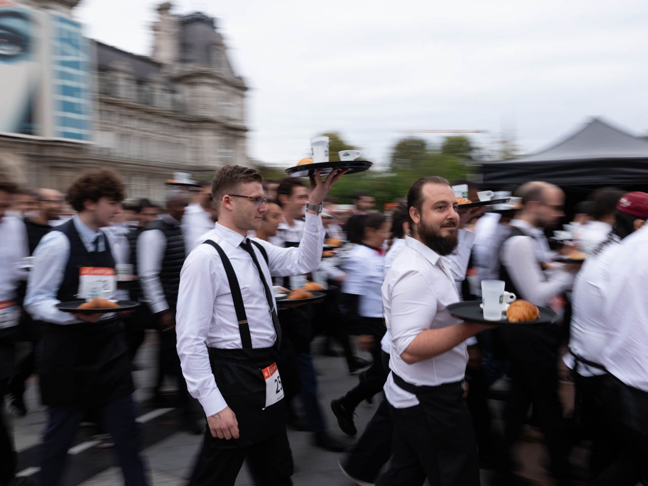 コースはマレ地区からセーヌ川沿いを抜け、市庁舎前に戻る約2km。規則は至ってシンプルだが厳格である。走ってはならず、片手で持ったトレーの上の品をこぼしてもならない。違反すれば失格となり、今年も14名が姿を消した。