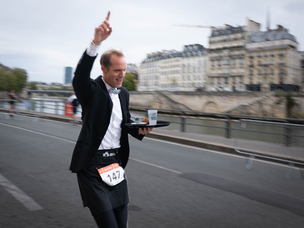 コースはマレ地区からセーヌ川沿いを抜け、市庁舎前に戻る約2km。規則は至ってシンプルだが厳格である。走ってはならず、片手で持ったトレーの上の品をこぼしてもならない。違反すれば失格となり、今年も14名が姿を消した。