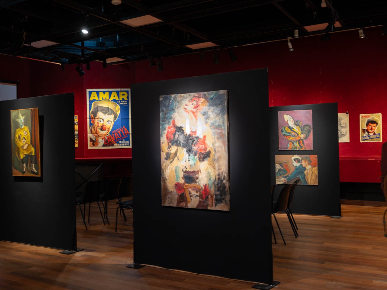 サーカスをテーマにしたオークションの展示室。クラウンやピエロを描いた絵画に加え、往年のサーカス団のポスターも並び、今なお人々を惹きつけるサーカス芸術の華やぎと郷愁を伝えている。