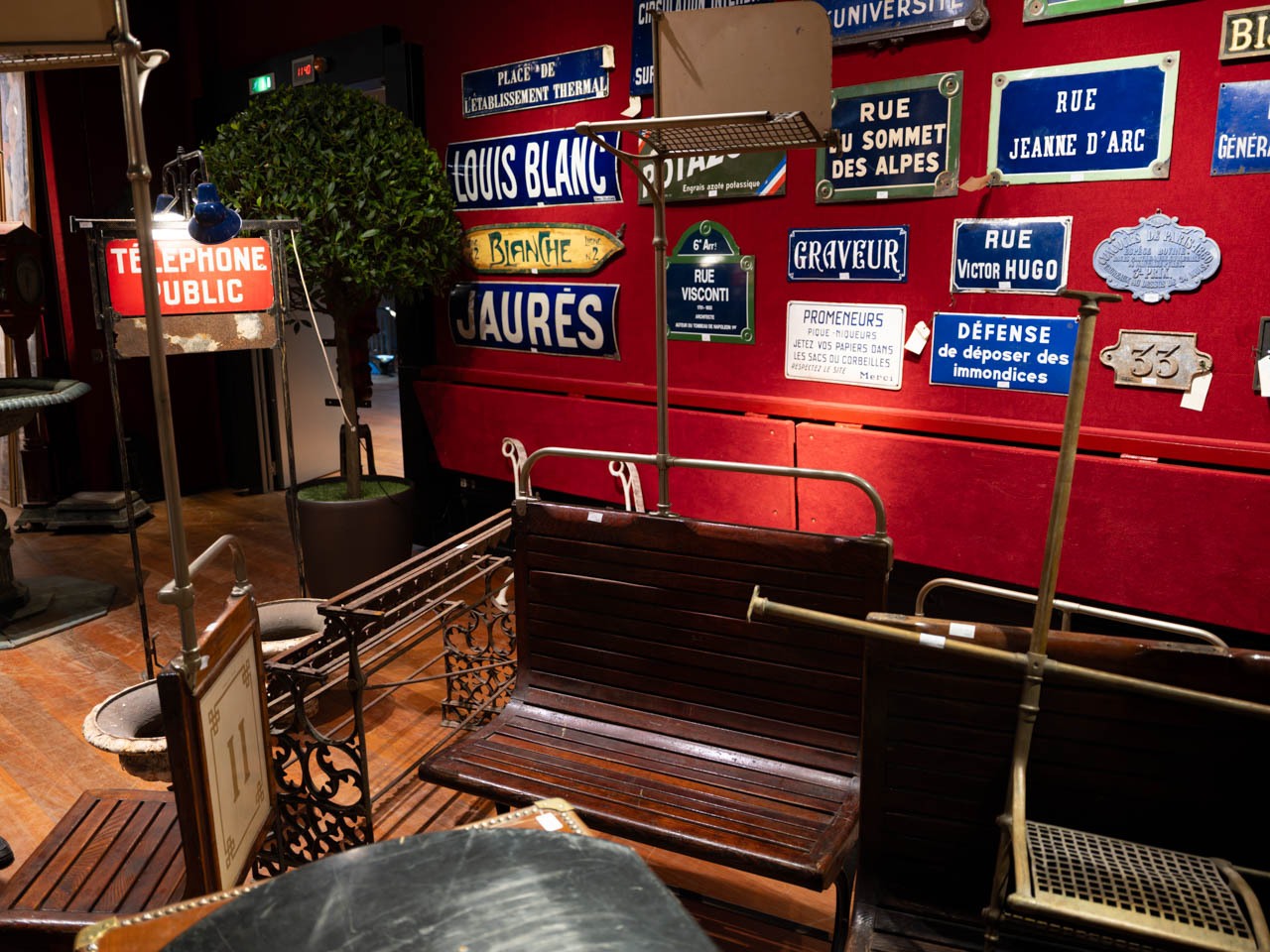 壁を彩る数々のパリのストリートサインの前には、地下鉄やバスで実際に使われていた木製のシートが並ぶ。都市の記憶をそのまま切り取ったような光景は、日常に潜むパリの歴史を鮮やかに蘇らせる。