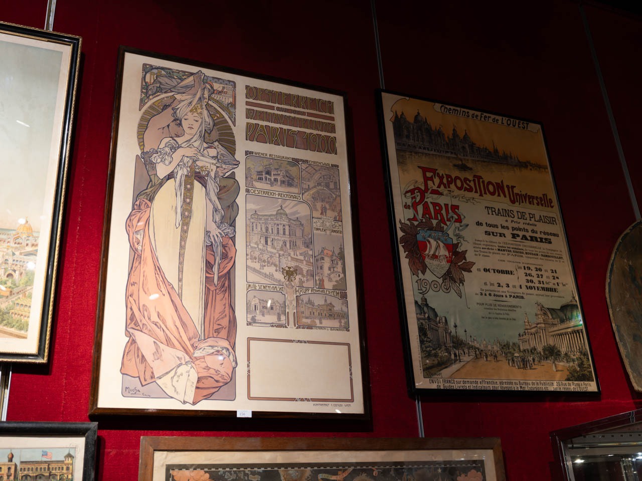 1900年パリ万国博覧会のために制作されたポスター。左はアルフォンス・ミュシャによるオーストリア館のリトグラフポスター、右はギュスターヴ・フライポンが手掛けた「西部鉄道」による広報ポスター。いずれも当時の熱気と華やぎを伝える貴重な美術印刷である。