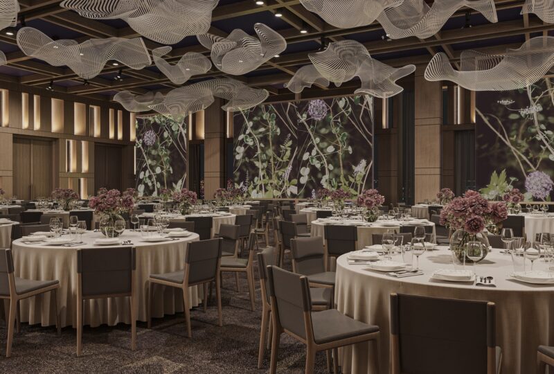 大人数でのイベントに利用可能な宴会施設も完備。日本初となる270度可動式LEDウォールを完備したJWボールルームのほか、6つのミーティングルームを擁し、晴天時には富士山を、夜には宝石のような東京の夜景を背景にした特別なイベントやウェディングが実現可能となっている。