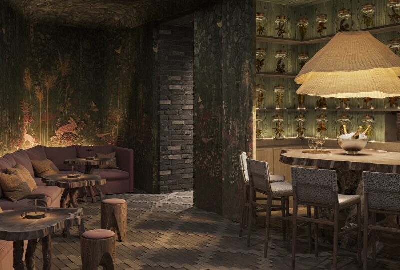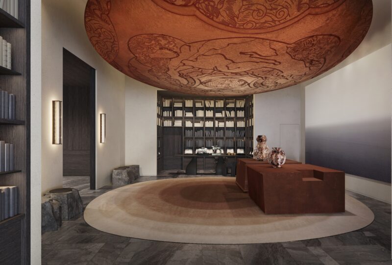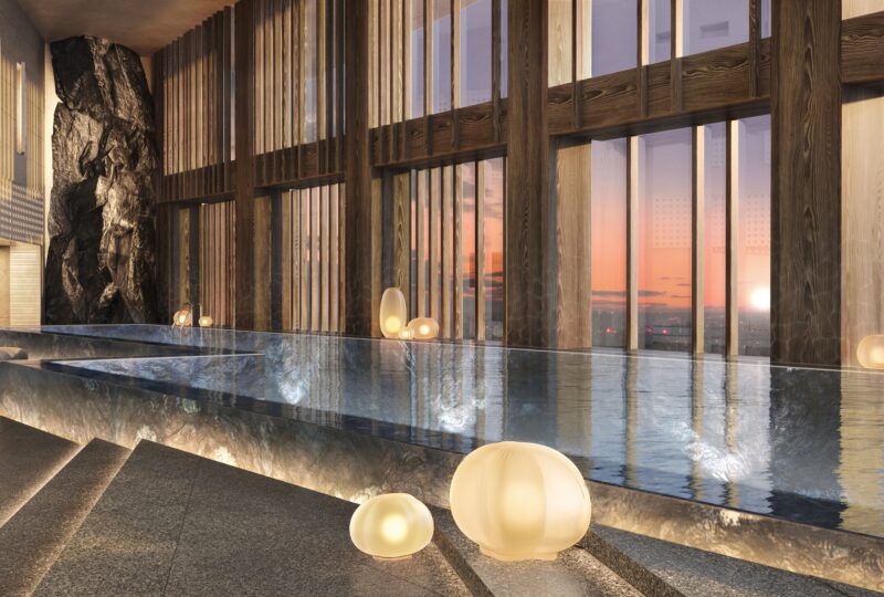 国際的に著名なデザインスタジオ「Yabu Pushelberg」が手がけた内装は、江戸時代の名勝・御殿山から着想を得た詩的な美しさに満たされる。深い藍と琥珀を基調とした配色が創り出す静謐な空間は、まさに都市の喧騒を忘れさせる桃源郷だ。レセプションの天井に描かれた禅の石と鏡面仕上げの富士山を模した、静けさと自然との深いつながりを想起させるアートワークが、訪れる者を別世界へと誘う。