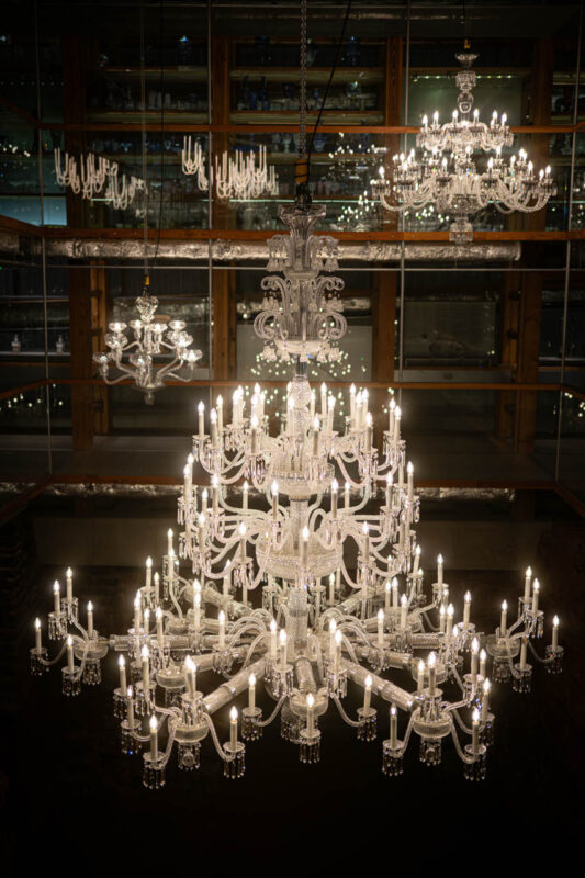 サン=ルイ・クリスタル博物館の吹き抜け空間に吊るされた、壮麗なクリスタルシャンデリア。1781年にフランスで初めて鉛クリスタルの製造に成功した Saint-Louis が誇る、カット、研磨、組み上げの集大成とも言える作品である。数百点に及ぶパーツが光を受けて反射と屈折を繰り返し、空間そのものを照明装置へと変えていくこのシャンデリアは、クリスタルが「器」や「装飾」を超え、建築と結びつく存在であることを雄弁に物語っている。