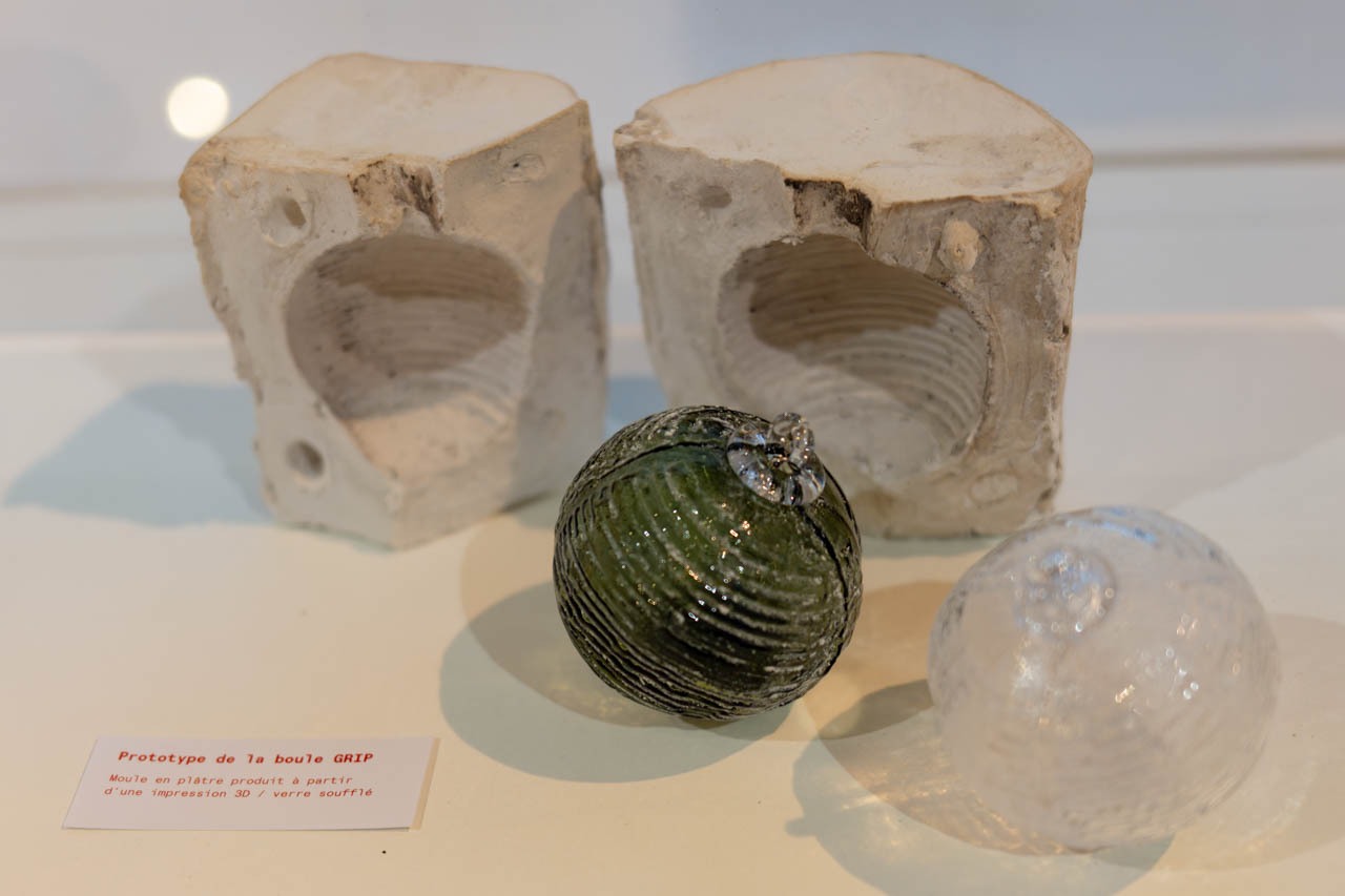 今年のブール・ド・ノエル「GRIP」の試作工程を示す展示。背後に置かれたのは、3D データから出力した原型をもとに作られた石膏製のモールで、前景には吹きガラスによる試作段階の球体が並ぶ。デジタルによる設計と、職人の手による吹き成形がここで接続され、最終的な量産へと移行していく。Meisenthal のブール・ド・ノエルは、伝統的な技法を守りながらも、新しい道具やプロセスを柔軟に取り込み続けることで、毎年更新される「現代の伝統」として成立している。