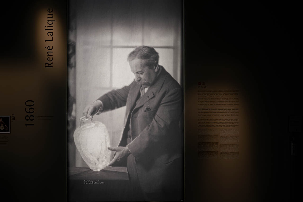 場所を移し、Wingen-sur-Moder(ヴィンゲン=シュル=モデール)に建つ国立ラリック博物館。展示の冒頭に掲げられるのは、ガラス作品を手に取るルネ・ラリックの肖像写真と、彼の歩みをたどる年表である。1921年、第一次世界大戦直後にこの地へ工房を移したラリックは、ヴォージュ北部に残る古いガラス産地と熟練した職人たちに、装飾芸術としてのガラスの未来を託した。宝飾家として名声を築いたのち、ガラス作家、装飾家、そして産業家へと領域を広げたラリックの軌跡は、アール・ヌーヴォーからアール・デコへと至る20世紀初頭の美意識の変遷そのものでもある。この博物館は、作品の展示にとどまらず、ひとりの創作者が「工房」と「ブランド」をいかに結びつけたのかを、土地の歴史とともに静かに語りかけてくる。