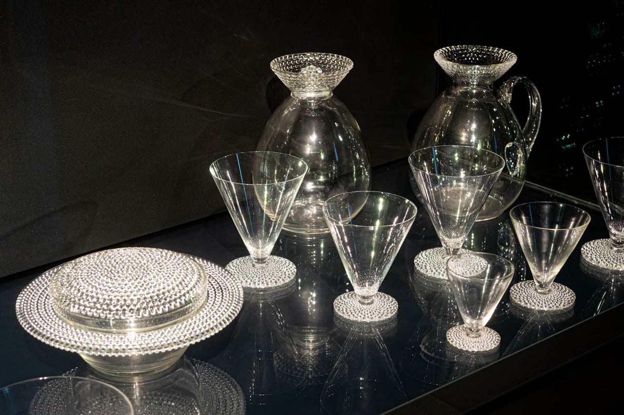 1930年に制作された《Service Tokyo》。吹き型とプレス成形を併用したガラスによるテーブルウェアのシリーズで、ラリックが日本市場を明確に意識して展開した代表的なモデルのひとつである。連続する小さな突起による装飾は、光を柔らかく拡散させると同時に、手に取った際の触感を重視した造形で、日本的な感覚に通じる静かなリズムを生み出している。過度な装飾を排し、透明度と構造そのものを美とするこのデザインは、アール・デコ期におけるラリックの成熟した造形思想を示すものであり、輸出向けでありながら普遍的なモダニズムを獲得したシリーズとして位置づけられる。