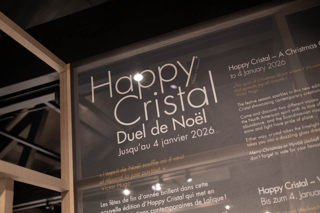 訪問時、館内では一般的な「Happy Christmas」ではなく、《Happy Cristal》と題したクリスマス展示が開催されていた。クリスマスという祝祭を前面に押し出すのではなく、主題をあくまで「クリスタル」に据え、ラリックの造形と言語で年末年始の時間を再解釈する構成となっている。展示空間にはヴィクトル・ユゴーの言葉が添えられ、光を受けて立ち上がるクリスタルの存在そのものが、祝祭の象徴として静かに機能する。宗教的・装飾的記号に依拠するのではなく、素材がもつ透明性、反射、拡散といった性質を通して季節性を表現する点に、この展示の特徴がある。「クリスマス」を語りながらも、その中心にあるのはあくまでクリスタルの造形美であり、ラリックが一貫して追求してきた“光を彫る”という思想が、現代的な展示文脈の中で再確認される場となっていた。 ※Happy Cristal – Duel de Noël(会期:〜2026年1月4日)