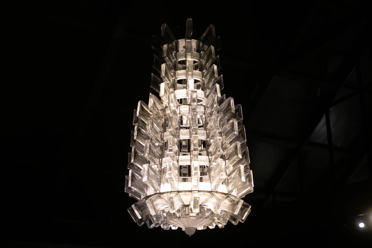 豪華客船ノルマンディ号(SS Normandie)は、1935年に就航したフランスの誇る大西洋横断客船であり、当時のアール・デコを結集した「動く近代美術館」と称された存在である。速度と快適性、そして芸術性を国家的威信として体現し、船内装飾にはラリックをはじめ、ルイ・シュエ、ジャン・デュナンら一流の装飾家が参加した。本作は、そのノルマンディ号の船内に実際に設えられていたシャンデリアと同型のもの。幾何学的に積層されたクリスタルの要素は、植物や古典意匠を離れ、光そのものを構築素材として扱うアール・デコの到達点を示している。段状に組まれたガラス片は、電灯の光を反射・屈折させながら垂直方向に立ち上がり、装飾であると同時に建築的な光の構造体として機能する。ノルマンディ号の壮麗なサロン空間において、このシャンデリアは単なる照明器具ではなく、近代フランスの技術力と美意識を象徴する存在であった。海上に浮かぶアール・デコ建築の内部で輝いたこの光は、ラリックが追求した「装飾・技術・産業の統合」を最も雄弁に物語っている。