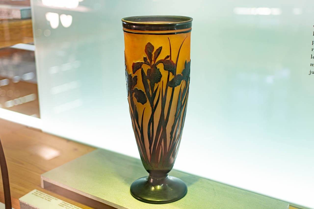 Saint-Louis におけるアール・ヌーヴォー期の到達点を示す花器。19世紀末、アルザスがドイツ帝国領であった時代にあっても、工房はナンシー派、とりわけエミール・ガレの自然主義的造形から強い影響を受け、植物を主題とした有機的な表現を発展させていった。複数色のガラス層を重ね、酸によるエッチングで段階的に削り出すことで、茎や花弁の奥行きが浮かび上がる。これらの作品は「Argental」の名で知られ、技術と詩情が交差したサン=ルイのアール・ヌーヴォー期を象徴する存在として、1930年代まで制作が続けられた。