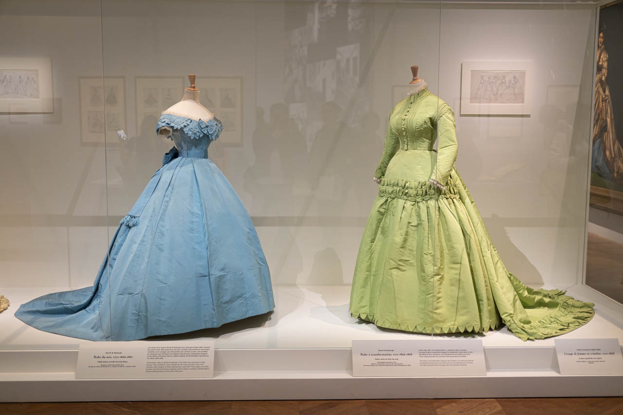淡いブルーとライトグリーンの《Robe du soir》(夜会服)と《Robe à transformation》(変容ドレス)が並ぶ展示は、1860年代のウォース&ボーベルグの洗練された美意識と機能性を象徴する一角。どちらもシンプルな単色に抑えられながら、豊かなクリノリンのシルエットと繊細な装飾により、皇后ウジェニーの時代を彷彿とさせる威厳と優雅さを宿している。昼と夜、そして静と動——衣服が語る社交界の時間がそこにある。