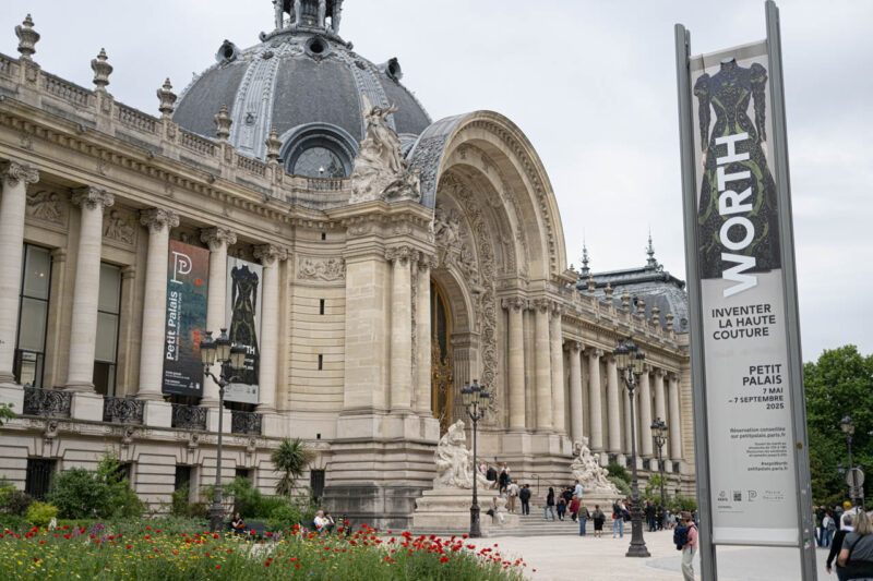 1900年のパリ万博のために建てられたプチパレ美術館の前庭に、「Worth – Inventer la haute couture」展を知らせるバナーが掲げられている。アール・ヌーヴォー様式の壮麗な建物とともに、ウォースが築いたエレガンスの系譜を現代に伝えている。