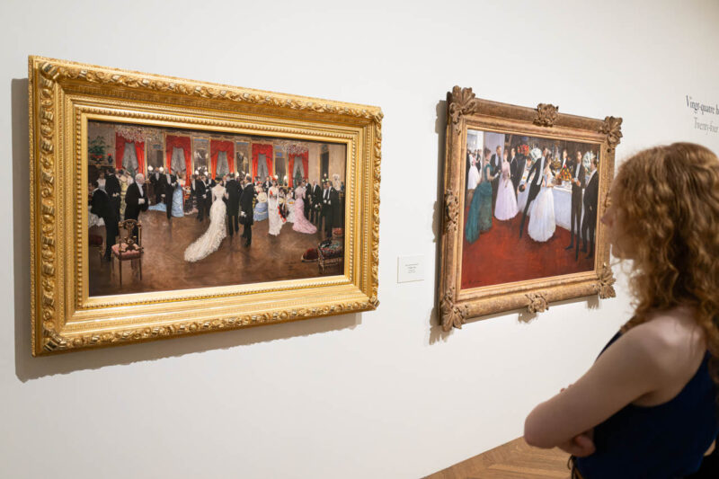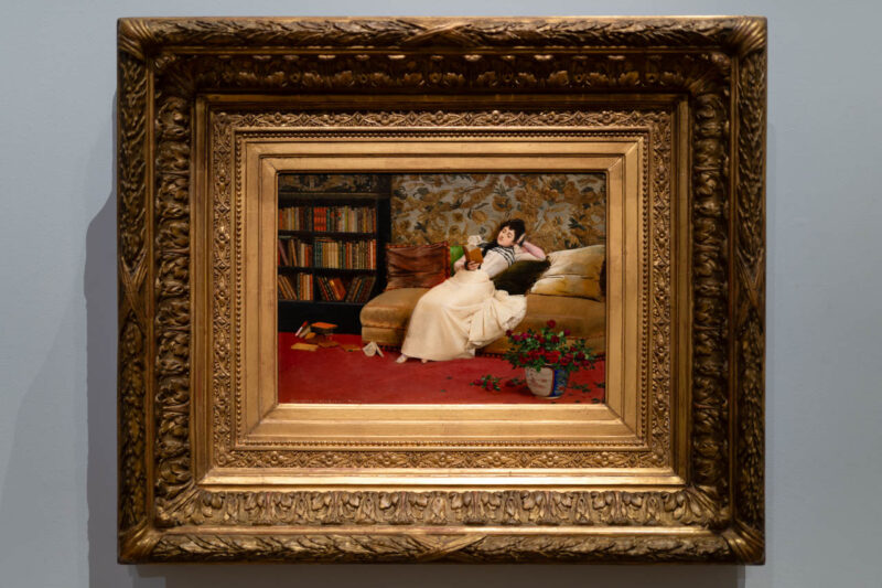 読書にふける女性の静かなひとときを描いたジョルジュ・クロエガールの《La Lecture》。上質な室内装飾と、ラウンジチェアに身を預けた柔らかな姿勢は、19世紀末ブルジョワ女性の私的な時間と審美的な暮らしを象徴している。ファッションとともに展示されることで、衣服が包む「生活の詩情」そのものが立ち上がってくる。