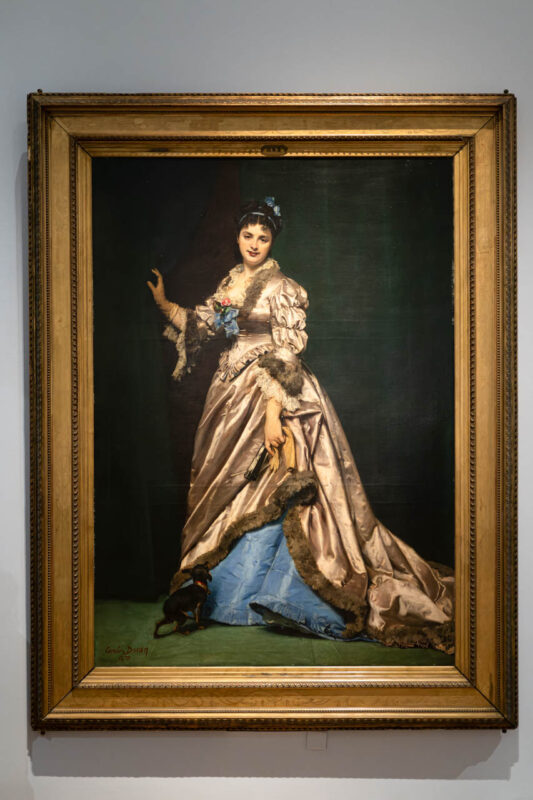 1870年に描かれた《La Dame au chien》は、華やかなドレスに身を包んだマダム・フェイドーの姿を通じて、ウォースの衣装がいかに絵画表現のインスピレーション源となったかを物語る。絹の反射、毛皮の柔らかさ、リボンや花飾りの繊細な質感まで、画家カロリュス=デュランは当時のファッションの“素材としての美”を見事に再現している。ウォースのドレスが芸術家たちのモチーフとなった時代の証しである。