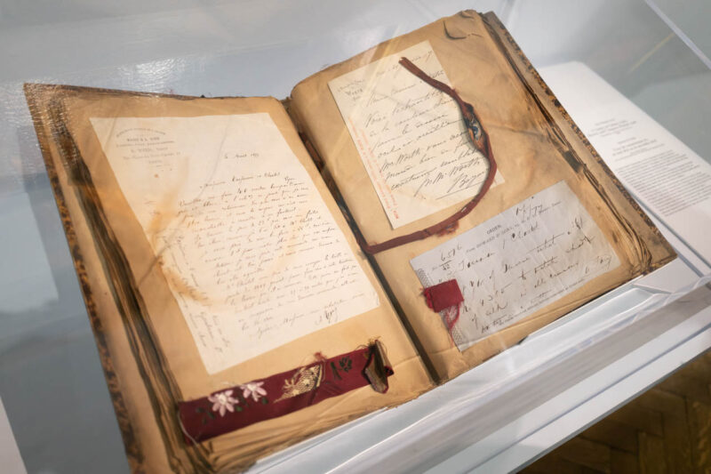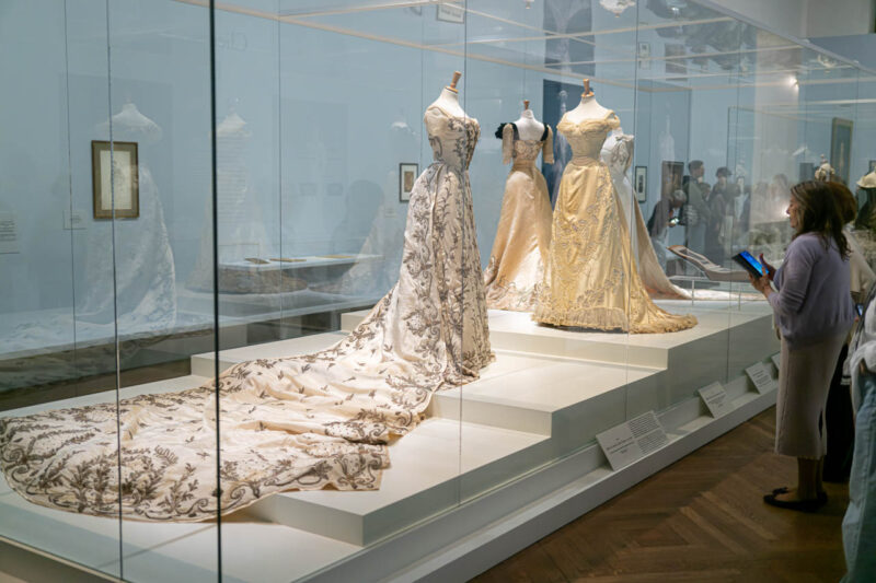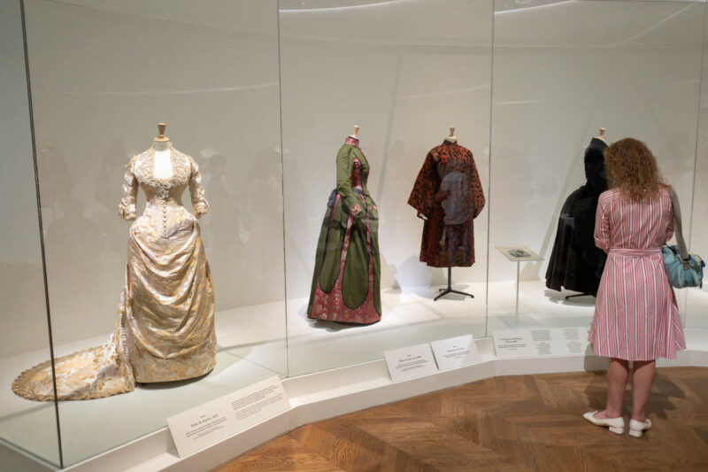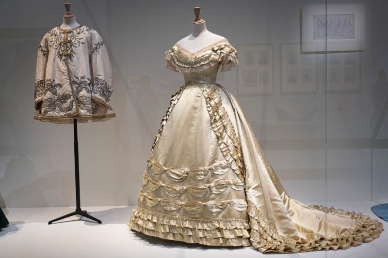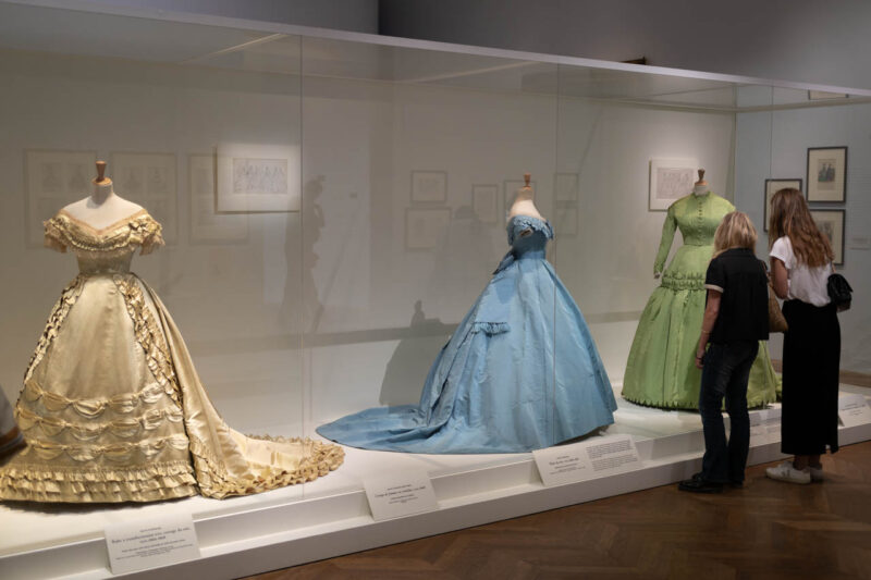 繊細な照明に包まれた展示室では、1860年代のドレスが静かに並び、当時のエレガンスが空間全体に漂う。厚みのある絹やチュールの質感、広がるスカートのシルエットが、ガラス越しに見る者の想像力をかき立てる。衣服が語る物語に耳を澄ませるように、来場者たちは一着一着に見入っていた。