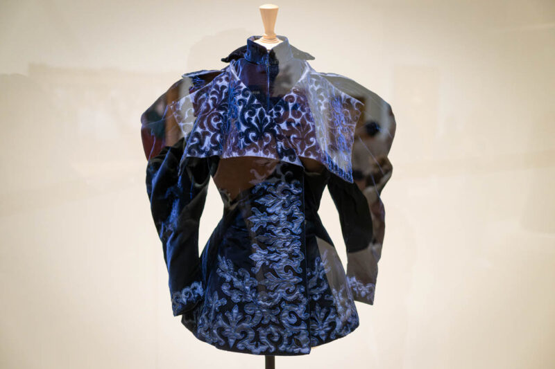 深い藍色のシルクベルベットに、光を受けて浮かび上がるサテンのアプリケーションが印象的な1895年頃のジャケット。誇張された肩のシルエットと、前面に施された精緻な文様が、ベル・エポックのモードにおける構築性と装飾性を体現している。アメリカ人メアリー・フリックが着用したこの一着は、パリ発のオートクチュールがいかに国際的な魅力を放っていたかを如実に物語る。