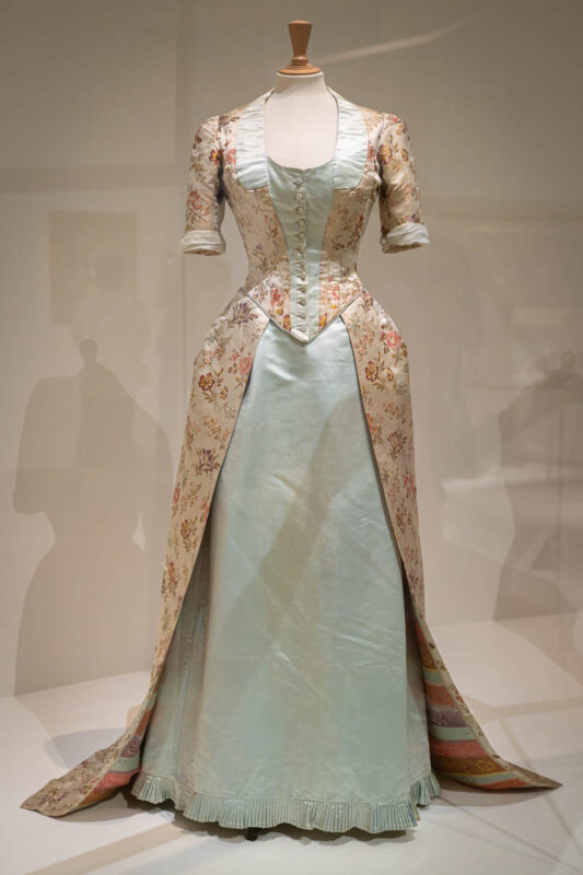 淡いブルーのサテン地に、花柄のブロケードを組み合わせた1885年頃の《Robe habillée》。光の加減でわずかに虹彩を帯びる裏地の縞模様や、ウエストから裾へ流れるラインの美しさは、ウォースが日常の装いにも芸術性を持ち込んでいたことを物語る。贅沢さと軽やかさを兼ね備えたこの一着は、まさに“装う歓び”を体現している。