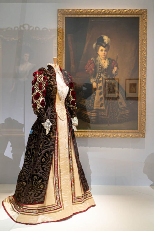 1893年、サガン公妃主催の仮装舞踏会にてマダム・ペクールが着用したこの豪奢なコスチュームは、スペイン宮廷の肖像画に着想を得たもので、袖に施された赤いビロードとメタリック刺繍が重厚な気品を漂わせている。背景に飾られた1859年の肖像画《ジャン=フィリップ・ウォース、インファンタの装いにて》との共鳴は、ウォース家がファッションにおいていかに歴史的意匠を引用し、再構築していたかを端的に示している。装いは舞踏会の仮装であると同時に、美術と記憶を繋ぐ鍵でもあった。