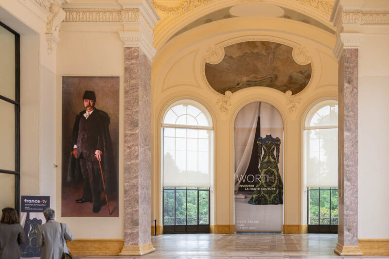 プチパレの館内には、チャールズ・フレデリック・ウォースの肖像とともに展覧会「Worth – Inventer la haute couture」の象徴的なドレスビジュアルが掲げられ、訪問者を19世紀ファッションの世界へと誘う。建築と衣服、二つの美が静かに共鳴する瞬間。