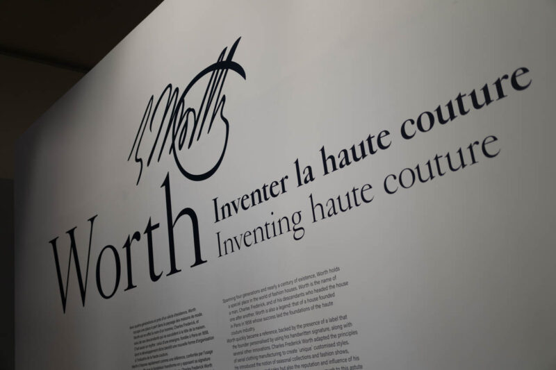 展覧会の導入部には、ウォースの署名とともに「Inventer la haute couture(オートクチュールの創造)」という言葉が掲げられ、ファッション史における革新の始まりを静かに告げている。