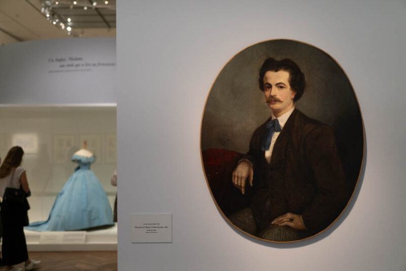 ヴィクトール・ジローが1857年に描いた《Portrait de Charles Frederick jeune》は、若き日のウォースの姿を記録する貴重な油彩画。背後には、同時代のブルーのクリノリン・ドレスが展示され、創業期の息吹が感じられる構成となっている。
