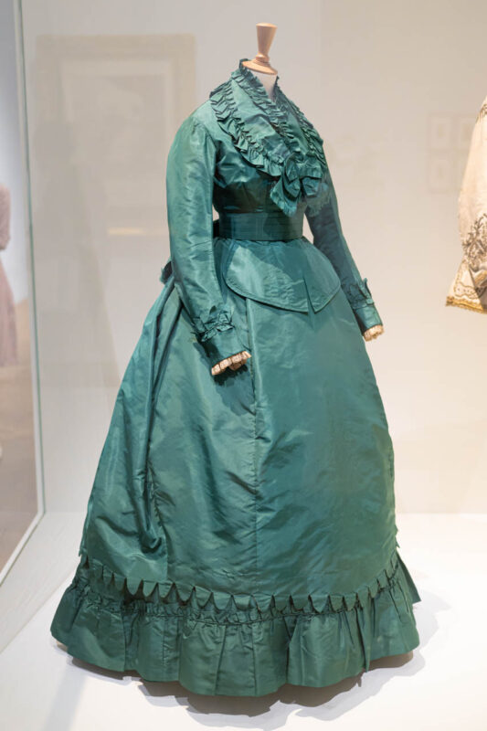 1869年頃の外出用ドレス《Robe de ville》。エメラルドがかった光沢を放つグリーンのシルクタフタに、アイボリーのレースをあしらった端正な構成が印象的。ラベルが確認される数少ない初期作のひとつで、宮廷や舞踏会だけでなく、日常の外出や旅にもふさわしい実用性とエレガンスが両立されている。