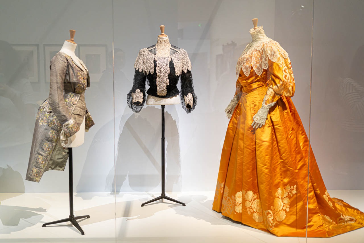 繊細な照明に包まれた展示室では、1860年代のドレスが静かに並び、当時のエレガンスが空間全体に漂う。厚みのある絹やチュールの質感、広がるスカートのシルエットが、ガラス越しに見る者の想像力をかき立てる。衣服が語る物語に耳を澄ませるように、来場者たちは一着一着に見入っていた。